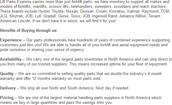 We have fantastic prices on all our forklift parts. For a price estimate on an attachment or part we offer, please contact us at: